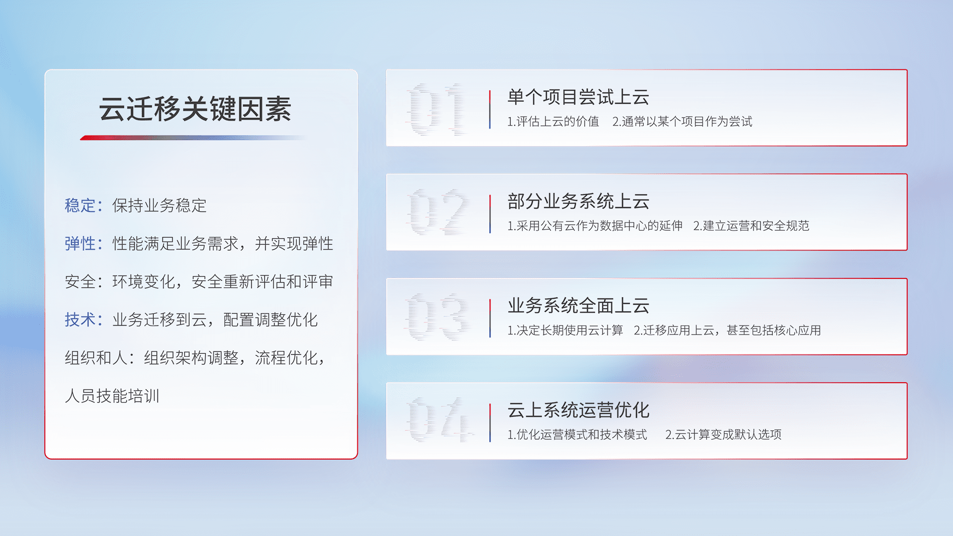 结合实际业务,,从规划设计、、、、云平台选型、、云原生改造、、、数据迁移、、集成交付,,,,迁移全过程为客户识别最佳上云路径,,,做好风险识别管理,,,设计网络架构、、、、身份权限、、、、安全审计合规、、、操作审计、、、、日志审计、、监控告警策略、、、、多站点容灾设计等,,,,对云上基础设施进行整体规划,,,,提升IT治理水平,,,以满足弹性、、、、高可用、、高性能的需求。。