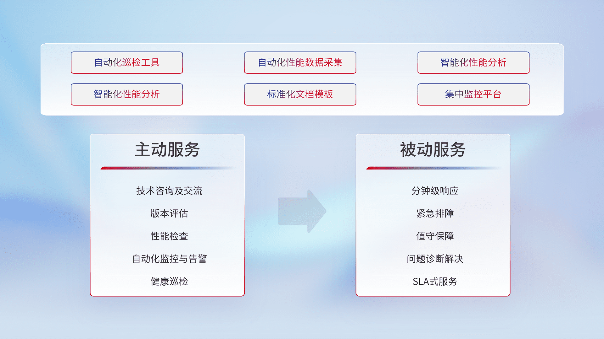 智能化工具和标准化文档,,保障服务质量,,,,提供主动服务(包含技术咨询、、版本评估、、、、性能检查、、自动化监控与告警、、、健康巡检)和被动服务包含(分钟级响应、、、紧急排障、、值守保障、、、、问题诊断解决、、、SLA服务)。。